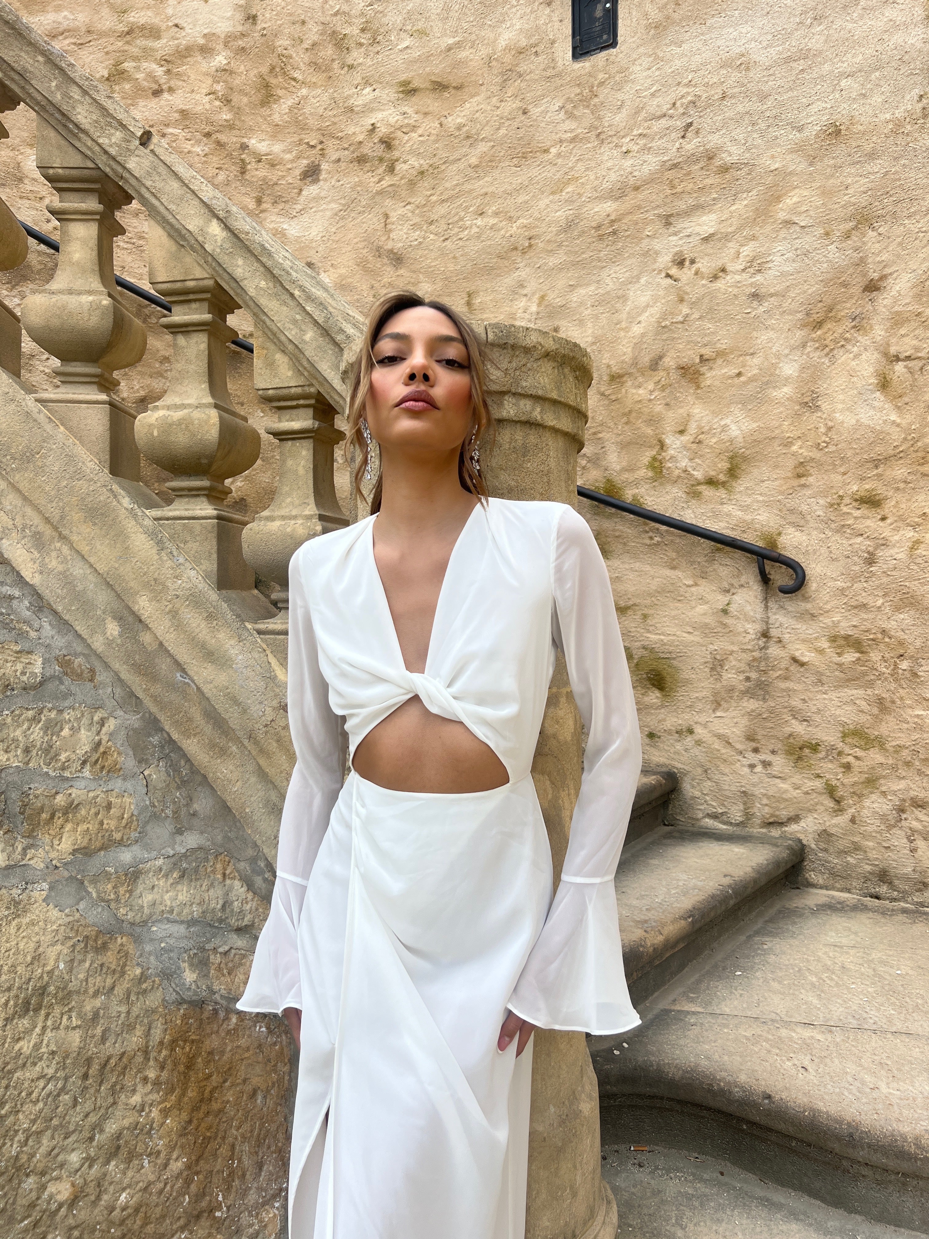 Malea, a chic maxi dress with a knotted cut-out and an extra long slit. The long fluttery sleeves are inspired by hawaiian flowers, so it became Malea.