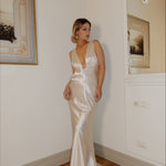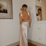 The Estelle Dress in Champagne Gold, featuring a low neckline with an adjustable band and a back to impress in low cowl style. Floor length, handpicked fine fabric designed to elevate your evening wardrobe.