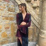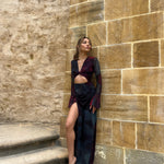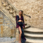 Malea, a chic maxi dress with a knotted cut-out and an extra long slit. The long fluttery sleeves are Inspired by hawaiian flowers, so it became Malea.